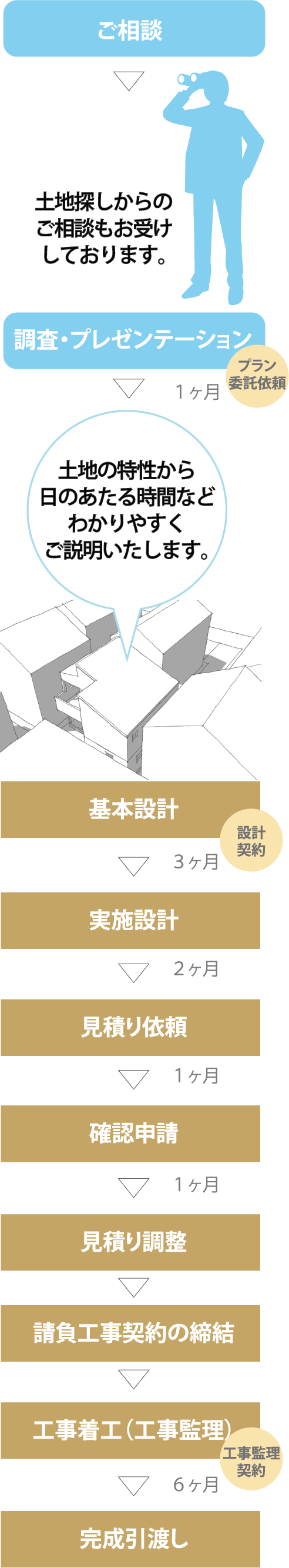 全⾏程で10〜14ヶ⽉ほどを要しますが、ご希望・ご相談の上、早めることも可能です。