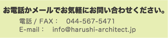 お問い合わせは、電話(044-789-8170)、Eメール(info@harushi-architect.jp)にてご連絡いただくか、または下記お問い合わせフォームにある必須事項(「*」印の項目)を全てご入力の上、「送信」ボタンをクリックしてください。