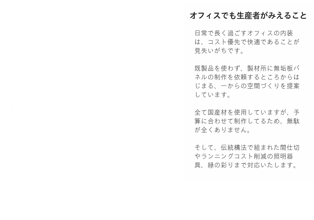 林業・製材・木材加工を行う山の職人の「自然の恵みを大切に、木1本を余すこと無く全てを使い切りたい。」という気持ちをくみ取り、丁寧なオフィス空間づくりをご提案しています。